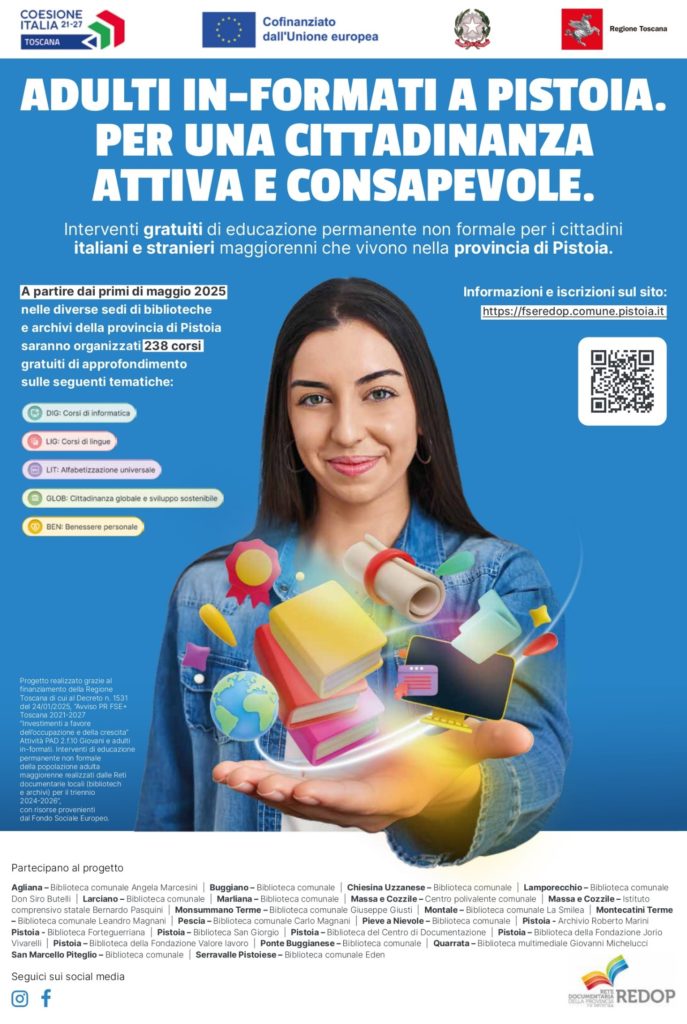 Il corso รจ realizzato all’interno del progetto “Adulti in-formati a Pistoia” finanziato da REDOP con il contributo della Regione Toscana di cui al decreto nยฐ 1531 del 24 01 2025 con risorse provenienti dal Fondo Sociale Europeo