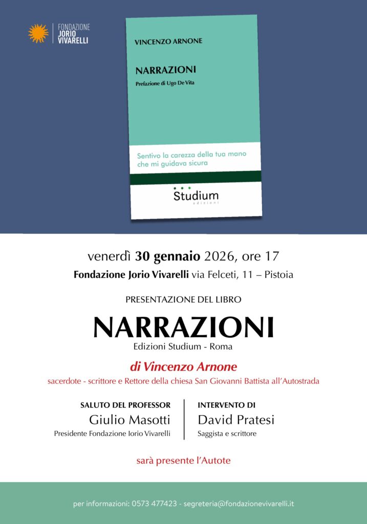 𝗩𝗲𝗻𝗲𝗿𝗱𝗶̀ 𝟯𝟬 𝗴𝗲𝗻𝗻𝗮𝗶𝗼 𝟮𝟬𝟮𝟲, 𝗼𝗿𝗲 𝟭𝟳:𝟬𝟬, presso la Fondazione Jorio Vivarelli in via di Felceti 11 a Pistoia, si terrà la presentazione del libro “Narrazioni” di Vincenzo Arnone, Edizioni Studium – Roma.